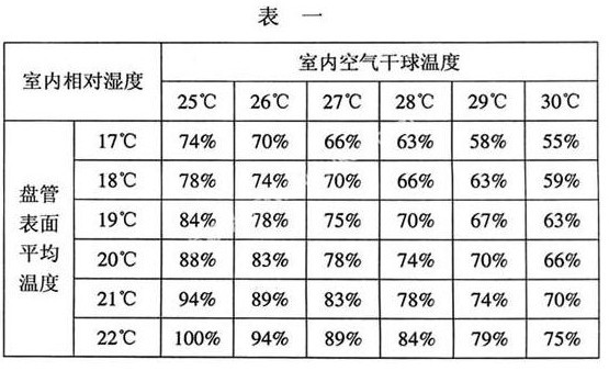 由于風機盤管的除濕能力有限,使得使用水空調的房間空氣相對濕度過高,常常會偏離人的濕度舒適范圍。我國南方由于夏季空氣非常潮濕,使用水空氣造成的室內濕度超標現象更明顯。如果假定盤管的除濕過程很順利,即結露很完全,接觸溫差取3℃。現查濕空氣焓濕圖并列表分析室內空氣的相對濕度:見表一。